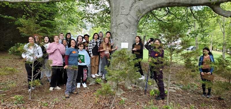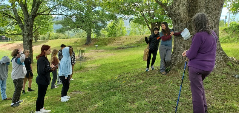 Four visitors from Treasured Trees visited our campus on Monday May 1st. Mr. Mallory's 4th Block Earth Environmental Class helped to dedicate five trees to join the Swannanoa Valley's local list of rare trees. Rarity is based on species, but primarily on the significant size and age of each individual tree. Mr. Mallory helped in the selection process last school year. Each tree got a permanent plaque with its common and scientific name, along with a QR code for more information. These trees can be visited by walking throughout the campus (after school hours), each tree adding to the value of our schoolyard's diverse natural habitat.